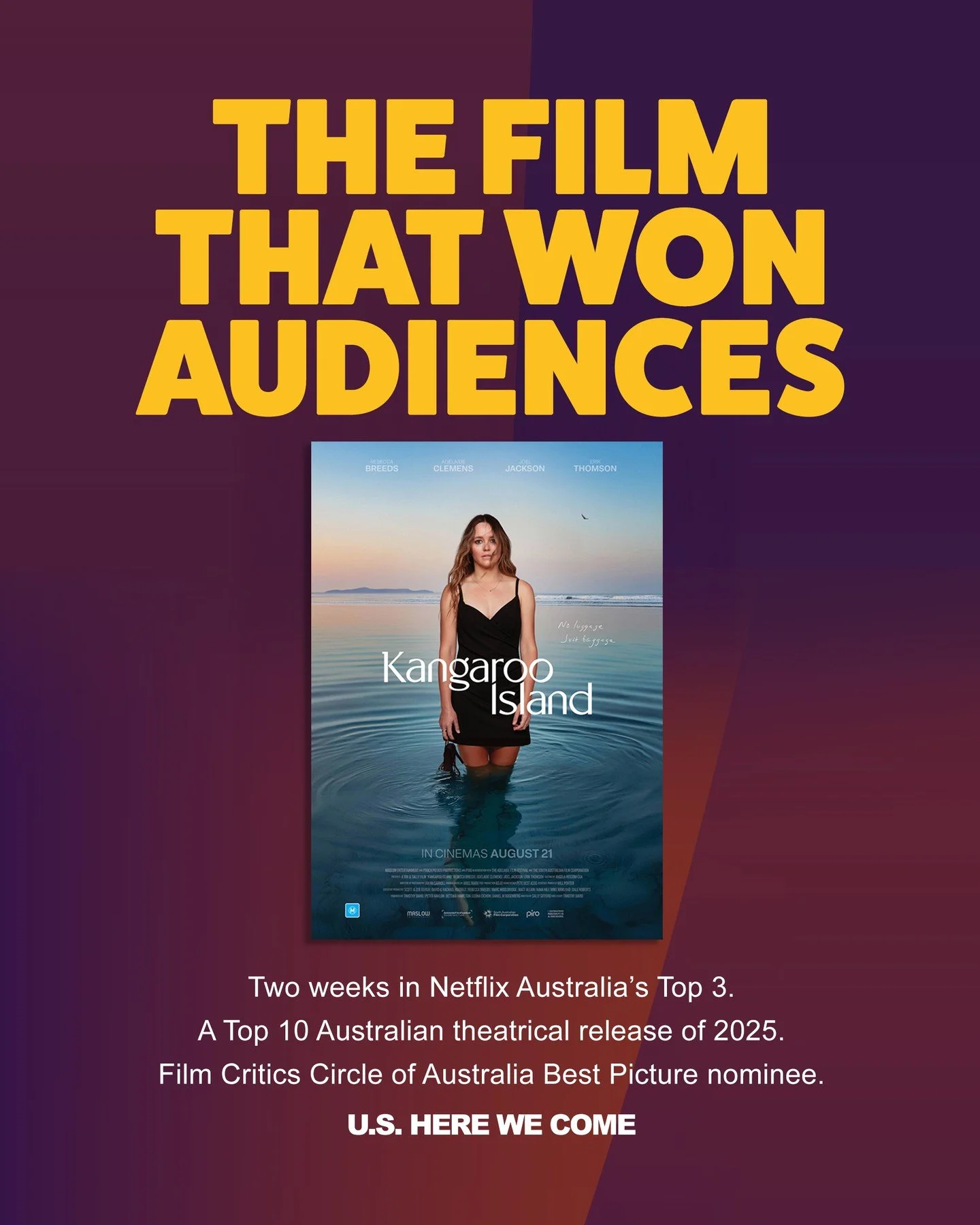 “Kangaroo Island” is an award-winning, theatrical feature film, written, directed, edited and produced at Piro, with the support of the South Australian Government. In its first two weeks of theatrical release it became one of Australia’s top ten grossing films of 2025, hailed by many as “the best Australian film in years” and some as “one of the best films in years.” A U.S. Audience survey (third party) showed a score above 9/10 (250+ audience). It is scheduled for US release in 2026 when it will also be available in Australia/New Zealand on a leading streamer, making it an enormous win for Tourism South Australia.